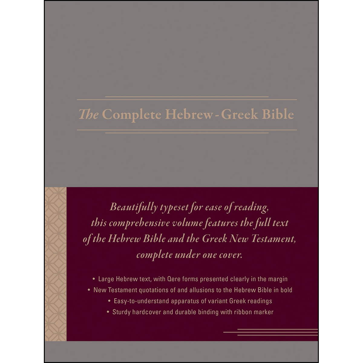Hendrickson’s The Complete Hebrew-Greek Bible combines under one cover the complete text of the Hebrew Bible and the Greek New Testament. Ideal for pastors, students, scholars, and anyone else who has studied both Greek and Hebrew, this is an excellent volume for those who want a complete original-language Bible in an attractive package and at an affordable price.